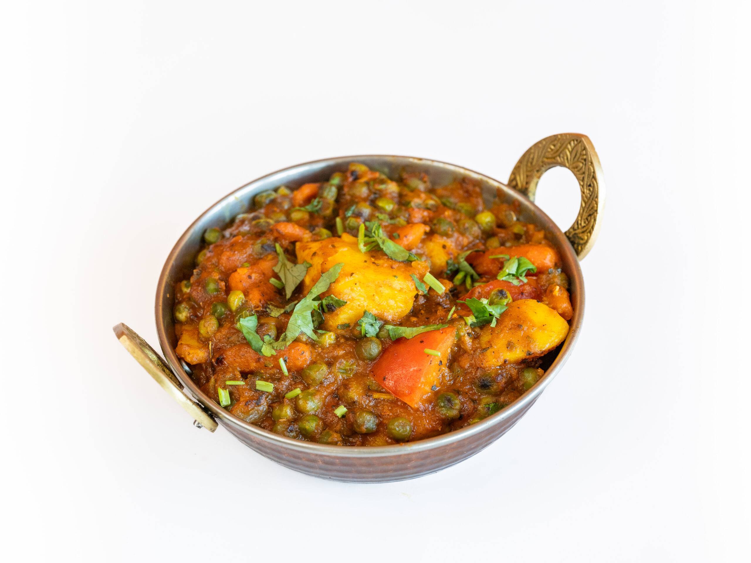 Aardappel en groene erwten in een kruidige currysaus.