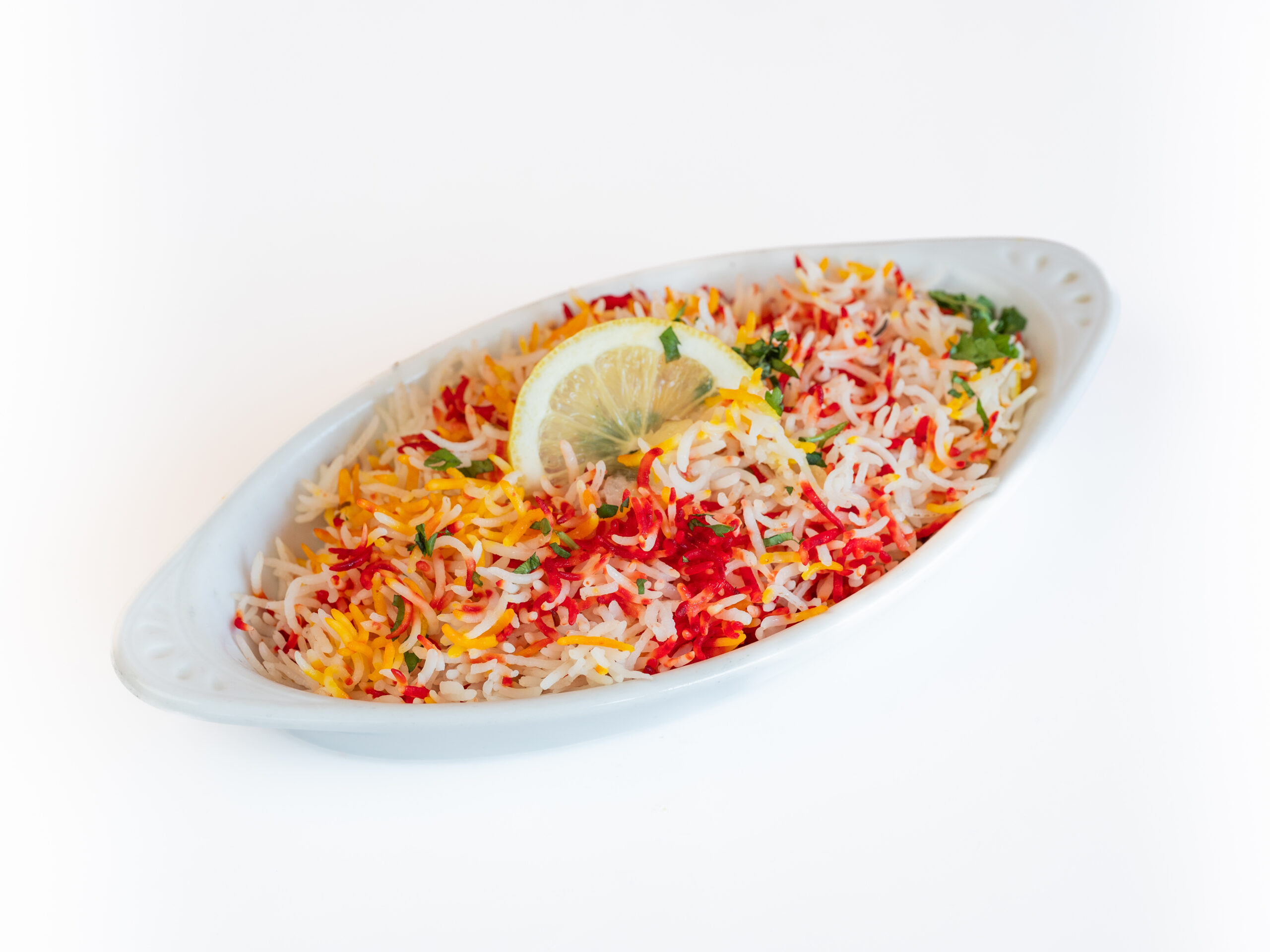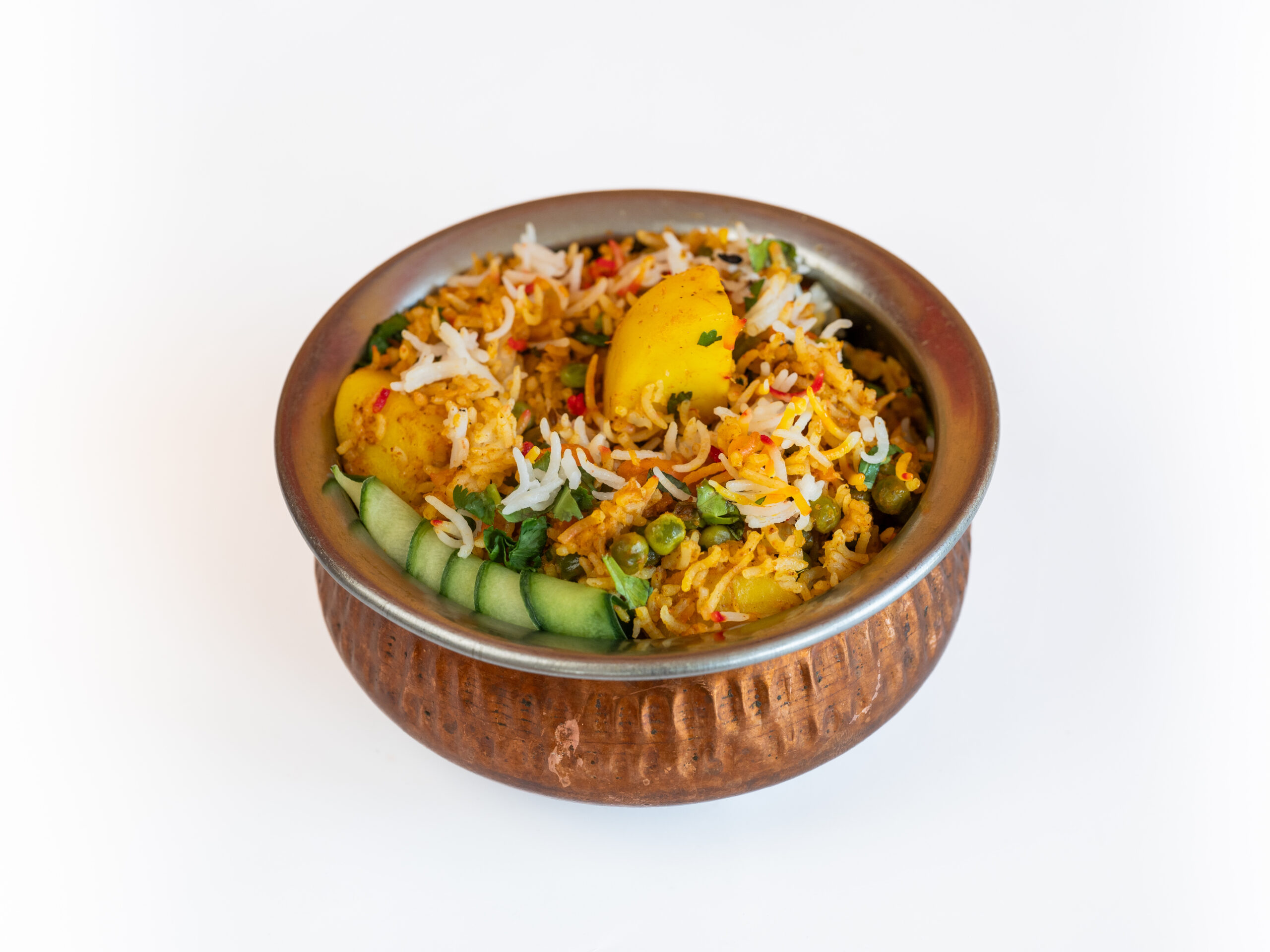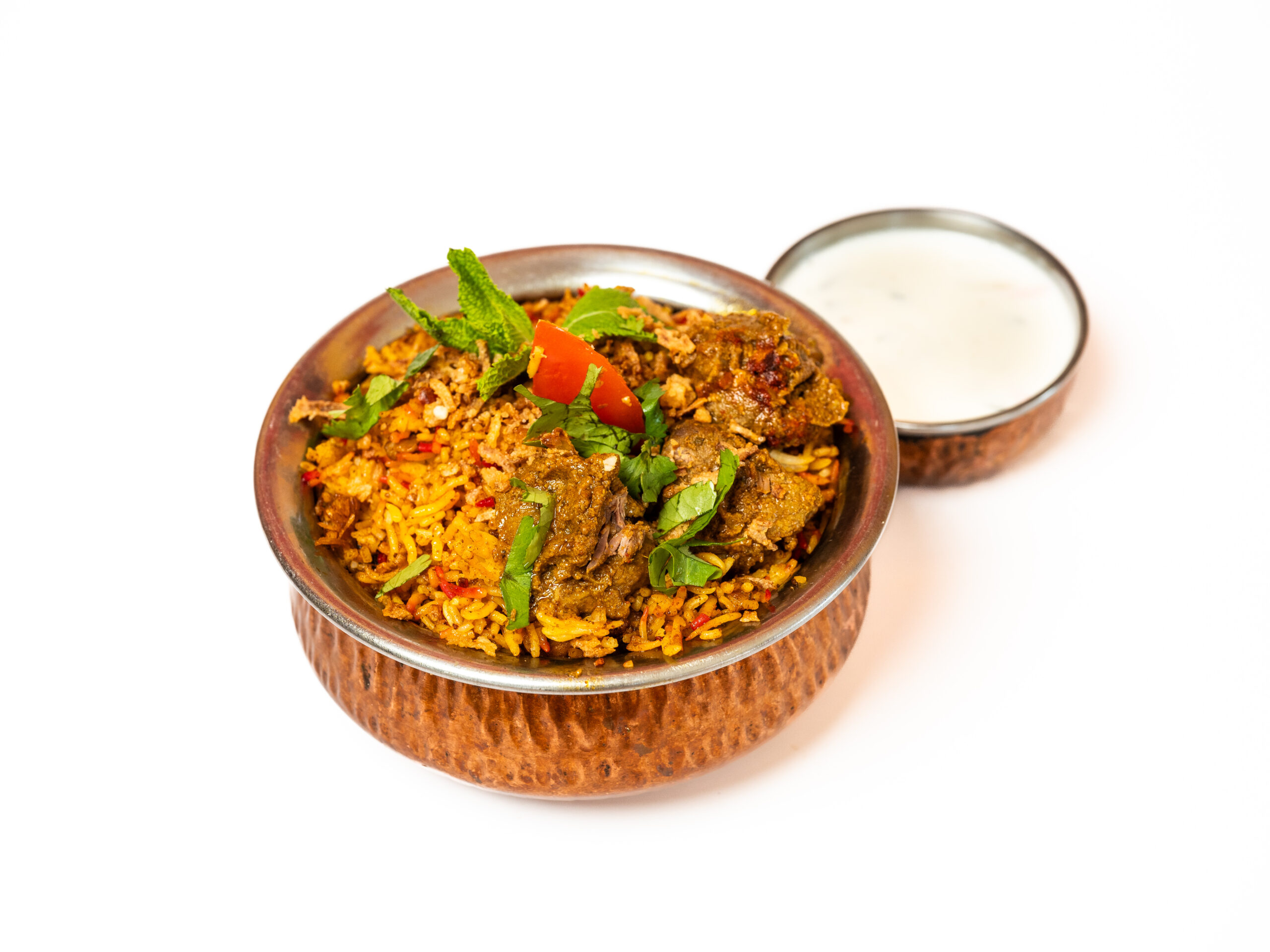 Basmati rijst met vers groenten met raita en pittig saus.