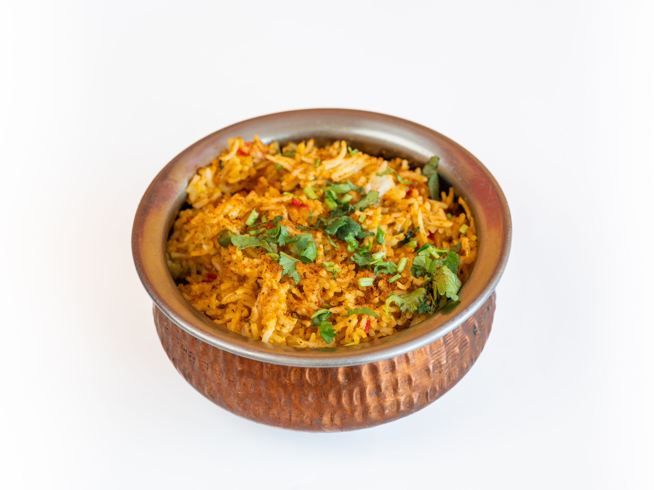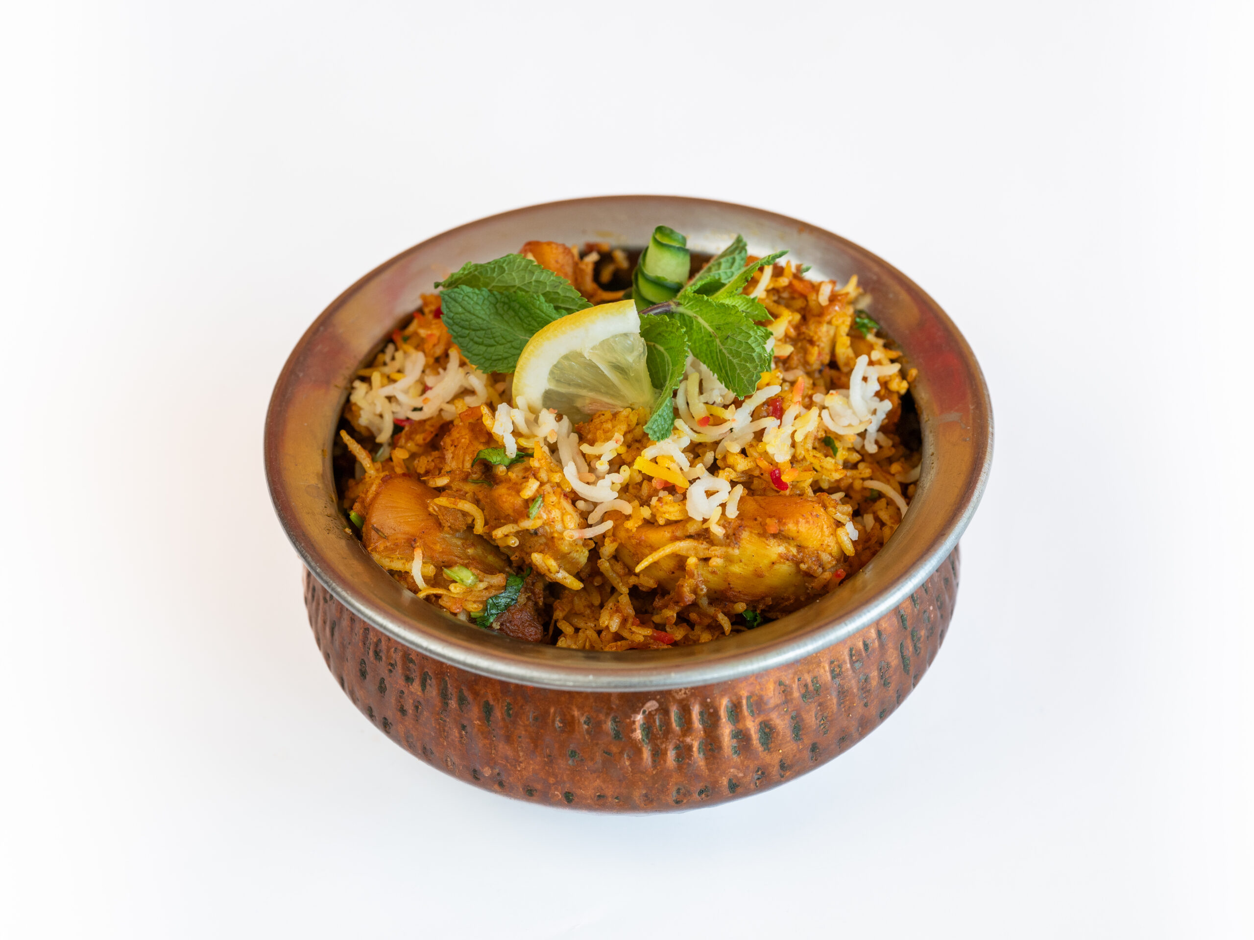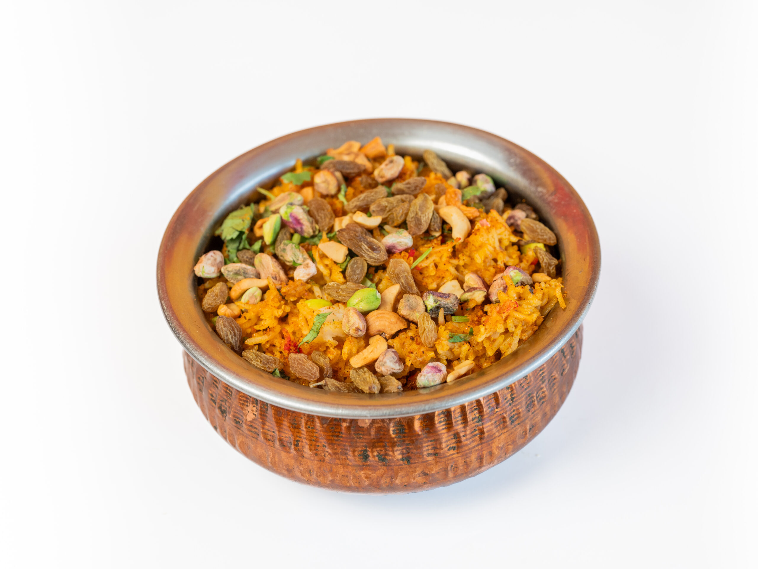 Basmati rijst met chicken tikka, cashewnoten, amandelen en rozijnen.