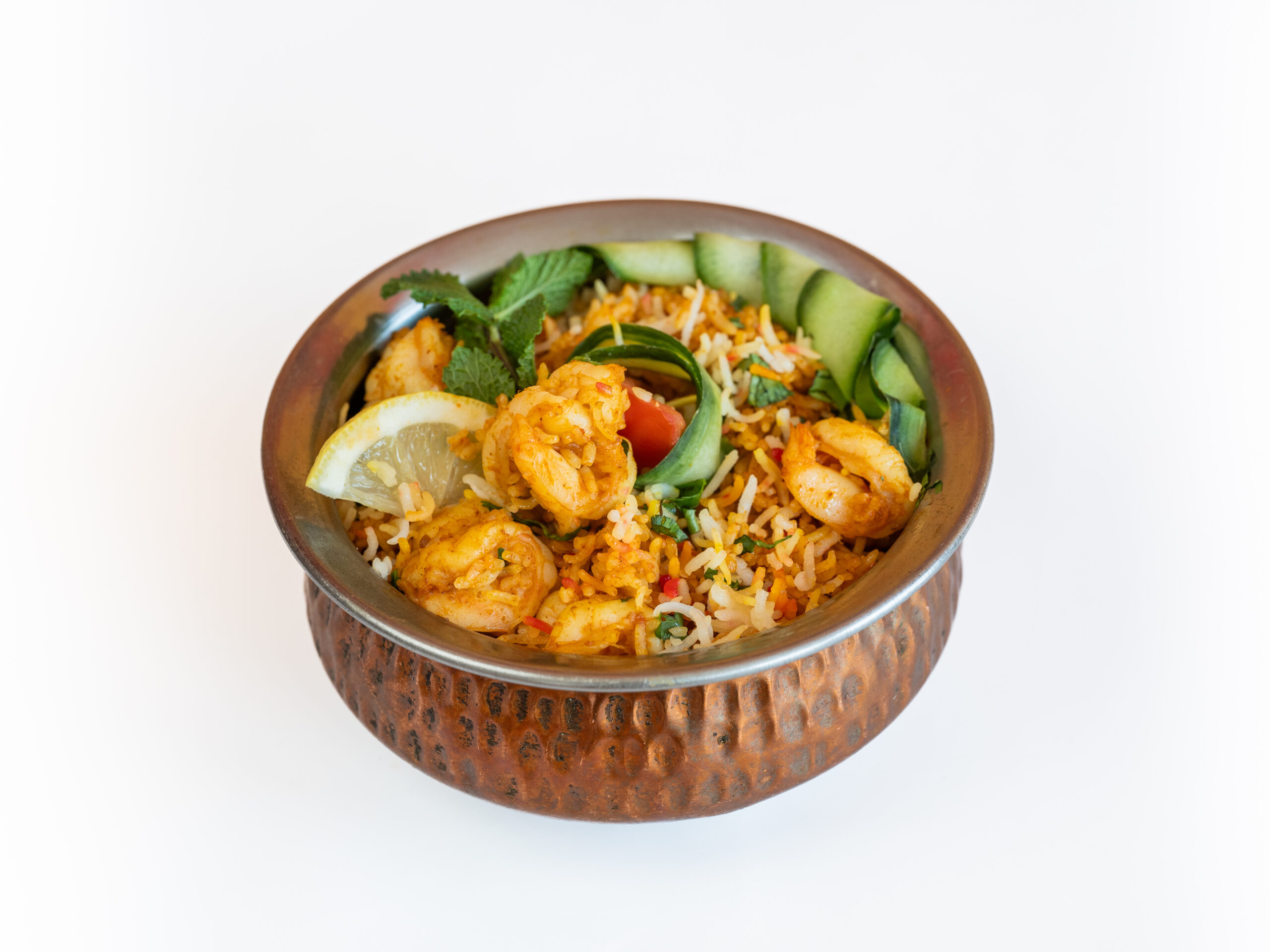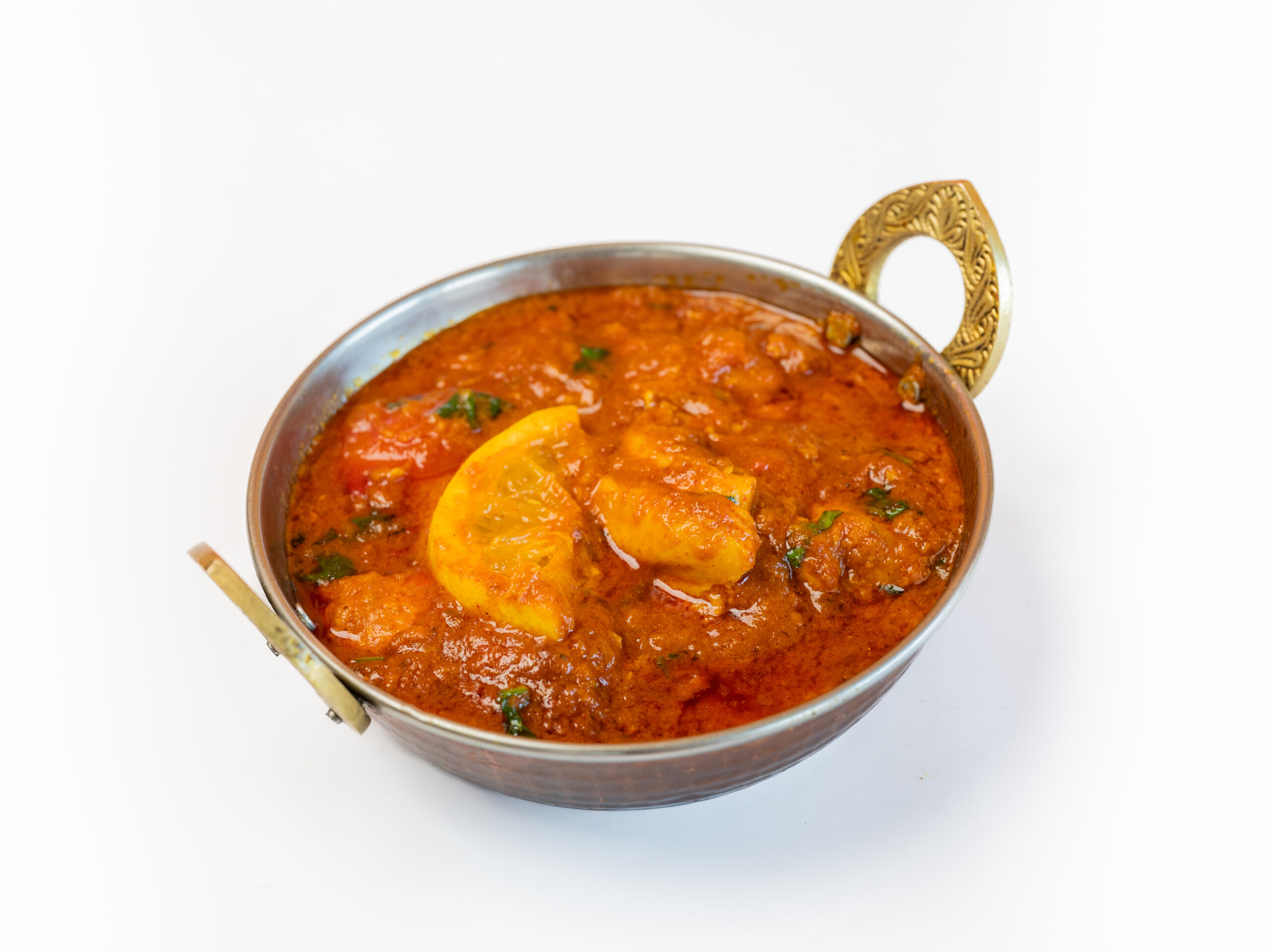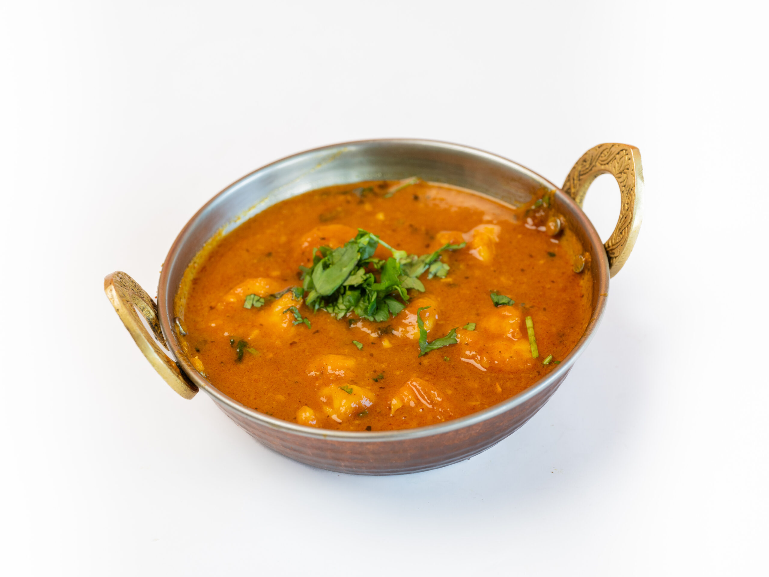 Medium curries. Grote garnalen bereid op kashmiri wijze: gebakken in gekruide olie met tomaten.