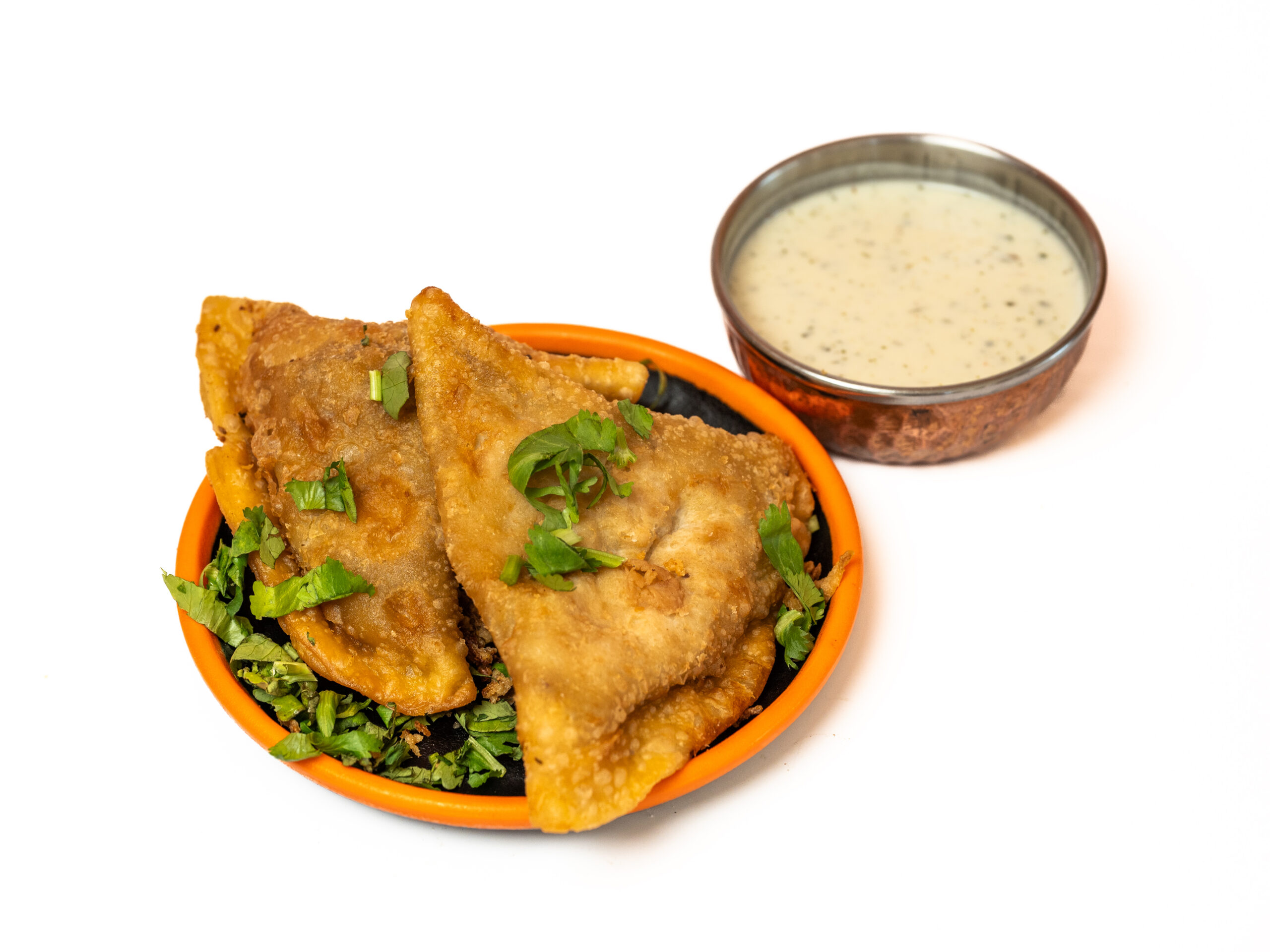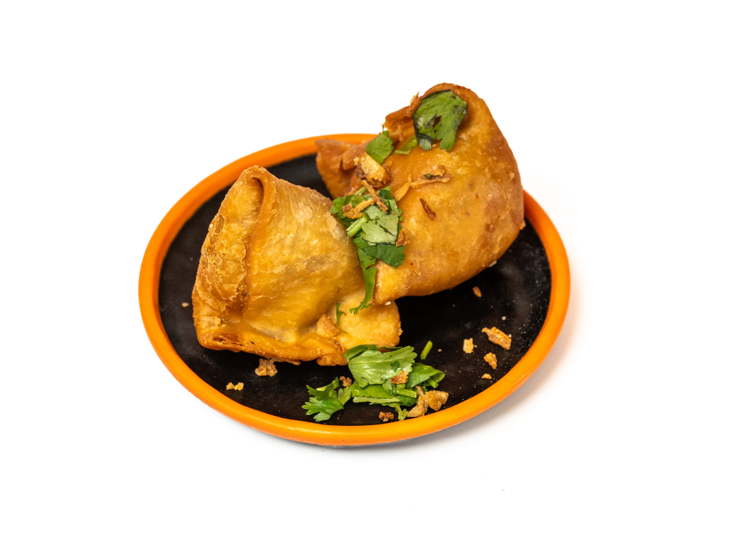 Gefrituurd pasteitje van bladerdeeg gevuld met aardappel, groenten en kruiden