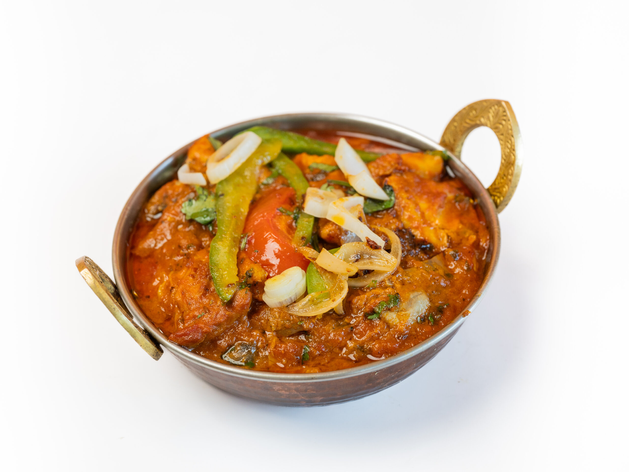 Authentieke Pakistaanse karahi (wok) met kip, tomaten, paprika en knoflook.