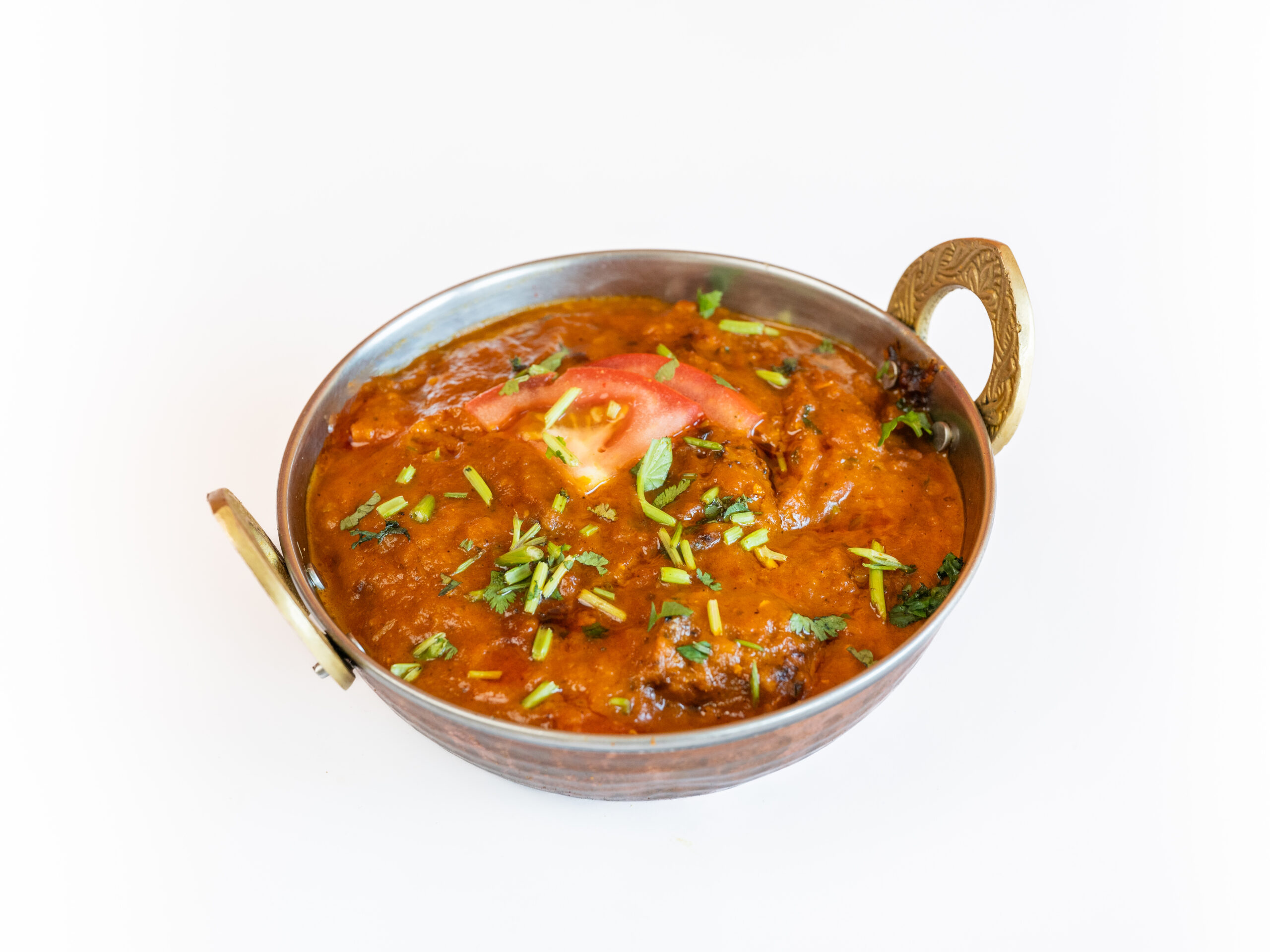 Medium curries. Lamsvlees bereid op kashmiri wijze: gebakken in gekruide olie met tomaten.