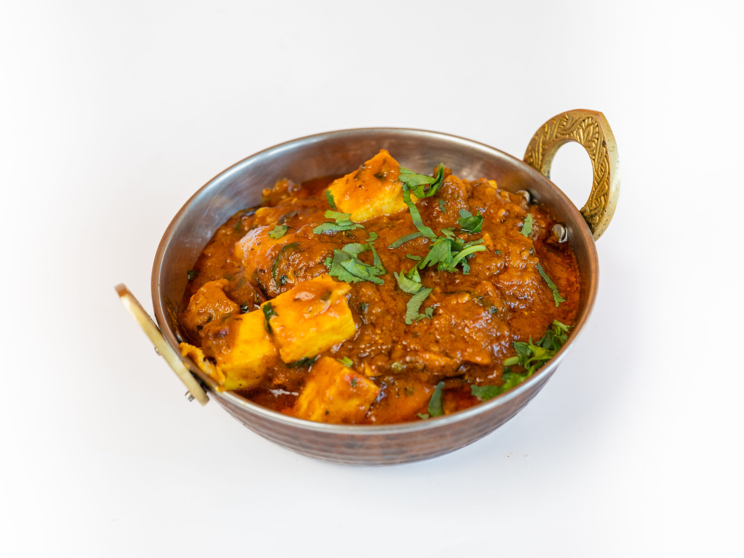 Cottage cheese en lamsvlees in tomatensaus met verse koriander en room.