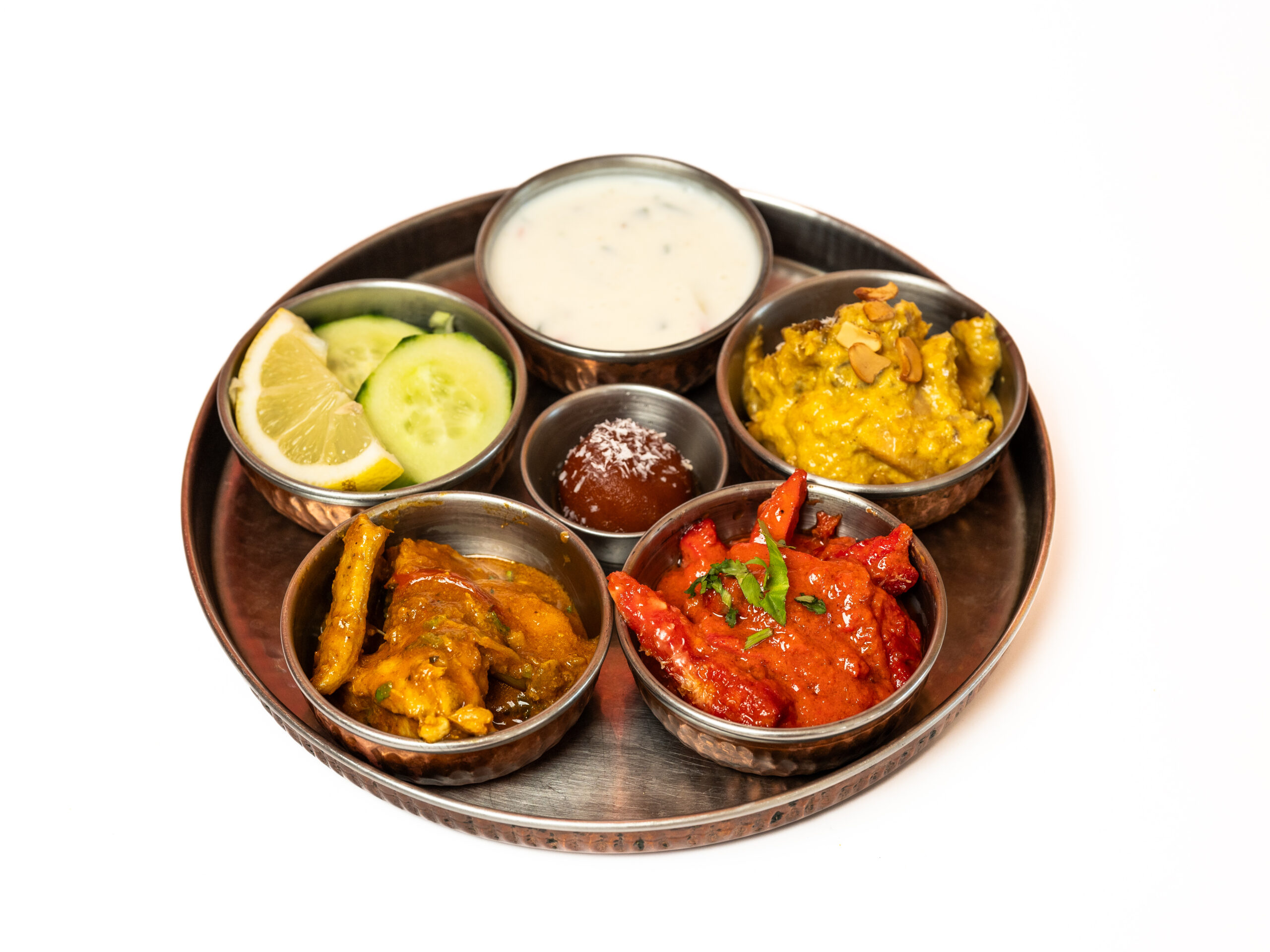 Kipcurry, lamscurry, curry met gemengde groente, gemengde salade, raita (yogurtsaus), gulab jamun (dessert)