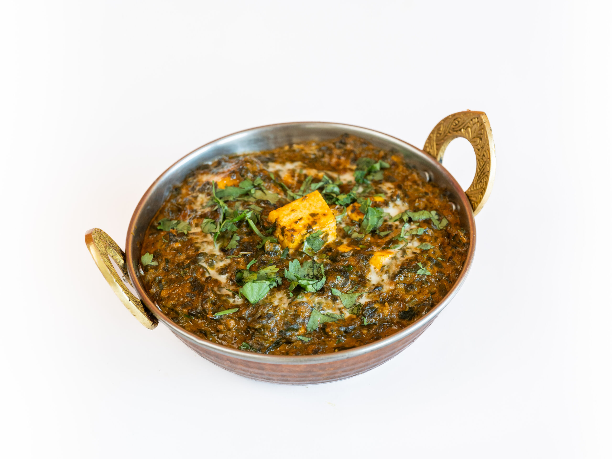 Verse bladspinazie met kaasblokjes in kruidige currysaus.
