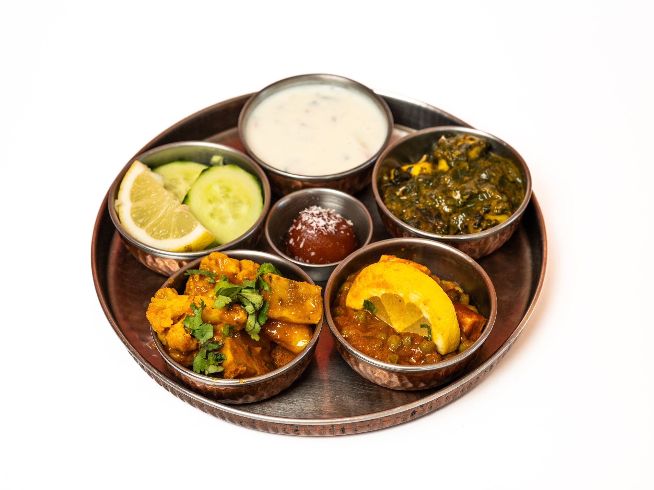 Palak paneer, curry met gemengde groente, daal (van linzen), raita (yogurtsaus), gemengde salade, gulab juman (dessert)